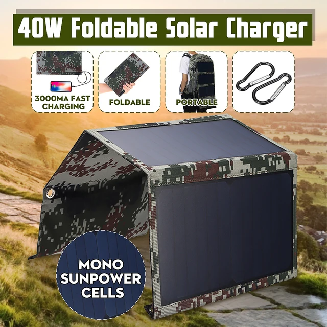 [4000093361156]Sunpower 40W 5V Foldable Solar Panel Charger w Dual USB Waterproof for Backpack Camping Hiking Climbing Power Bank for Huawei Phone SamsungFeatures:? High-Efficiency Sunpower Monocrystalline Cell, up to 24%.? Constructed by high quality material, eco-friendly, waterproof, durable and sensitive.? Can be used for charging cellphones, mobile power bank, etc.? Portable, foldable and lightweight, easy for carrying.? Offers continuous power supply even on overcast day.? Suitable for outdoor activities, emergency, and outdoor working.Main Parameter:Pmax: 40WUSB Output Voltage: 5VUSB1 Output Current: 3000mA USB2 Output Current: 2500mAConversion Efficiency: 24%Material-Panel: PET Laminated Sunpower Monocrystalline CellsMaterial-Bag: IPX5 Water-Proof NylonColor: CamouflageSize & Weight:Eyebolts Quantity: 2PcsEyebolts Diameter: 9mmExpanding size: 680x290x3.5mmFolding size: 290x165x25mmWeight: 490GPackage Include:1X 50W Foladable Solar Charger w Dual USB Port2X Carabiner NOTE:? The parameter on is tested under a ideal condition of AM1.5 1000W/m 25?? The actual output is related to the condition for using like temperature, sunlight direction, shadow, etc.? The USB Output Current is tested with single USB using.